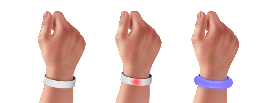 The bracelet is designed for instinctive use even under stress: a long press triggers alert mode, displaying a red light through an animation designed to mimic the crowd parting to make way for the user.