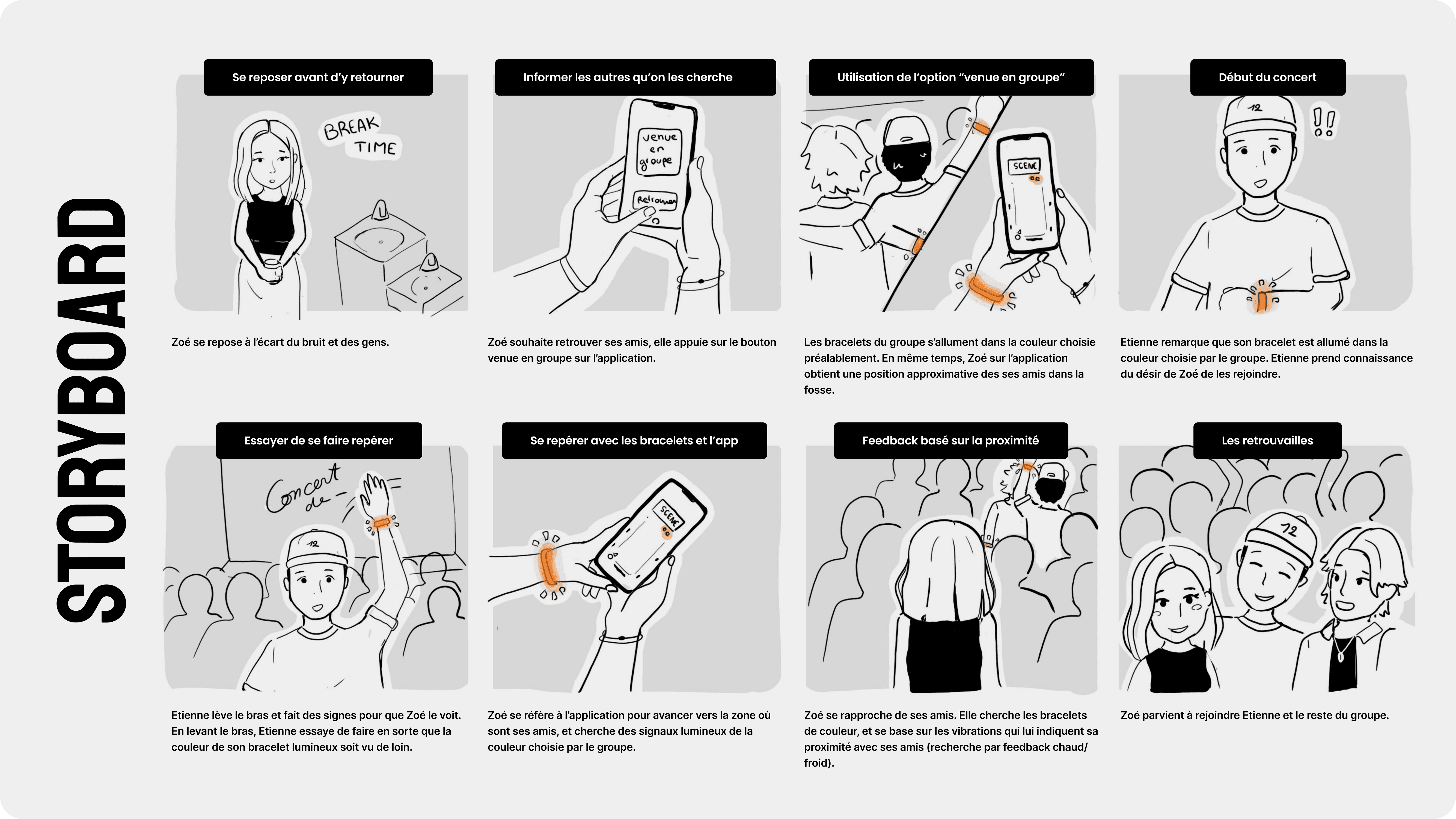 We tested our rough initial concept through a storyboard scenario starring our two personas Zoé and Étienne, following the format of a 5-second test in order to assess participants’ understanding of how the device worked, their perceived interest on both personal and collective scales, anticipated limitations, as well as suggestions for improvement.