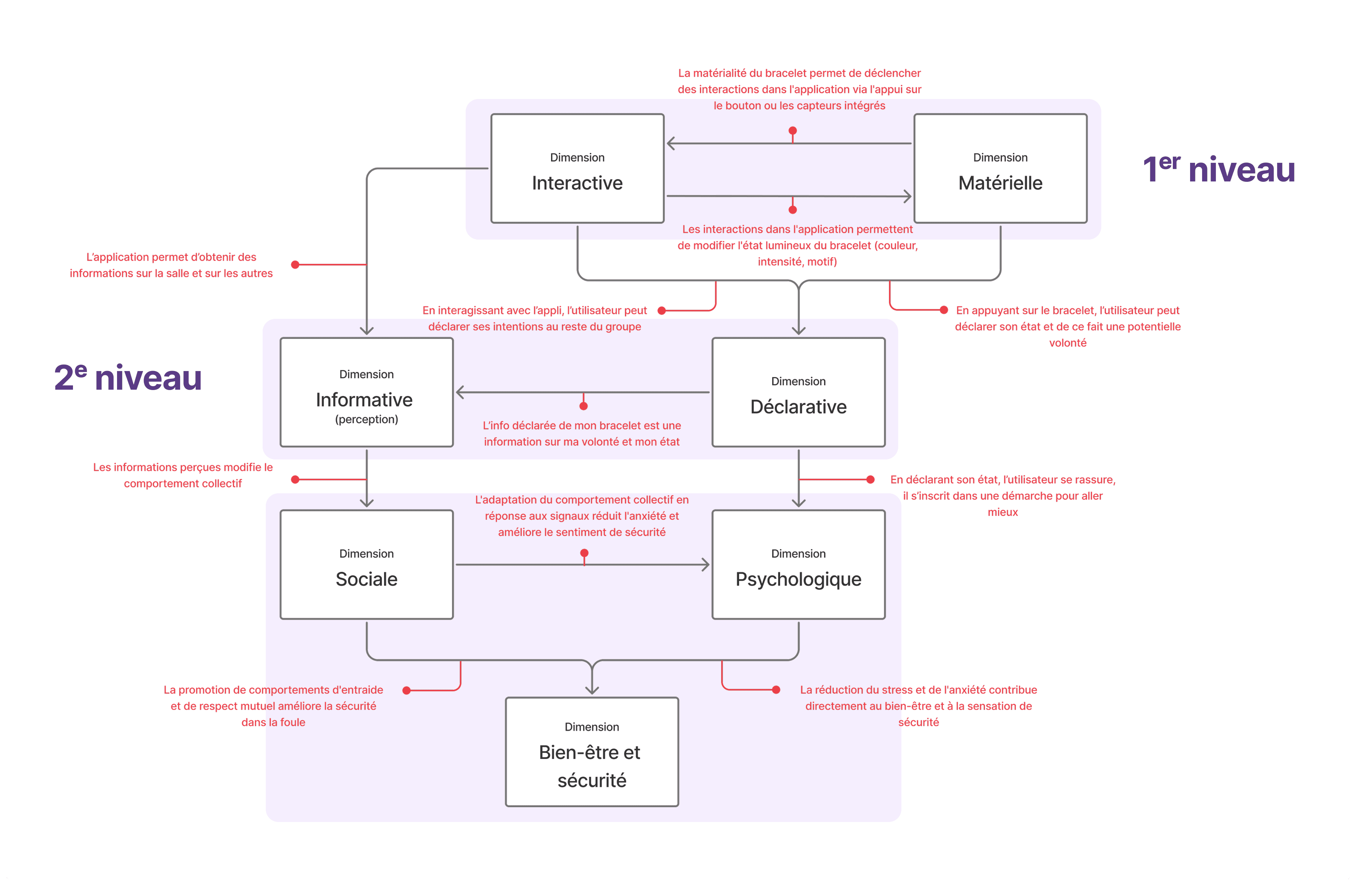 Alongside defining features, we framed our design decisions through key dimensions. At the most tangible level, the material and interactive dimensions describe how the bracelet and app respond physically to user input. These feed into the informative and declarative dimensions, where individual signals become meaningful information for others. Finally, the social and psychological dimensions address the broader impact: encouraging mutual aid, reducing anxiety, and fostering collective well-being in crowded spaces.