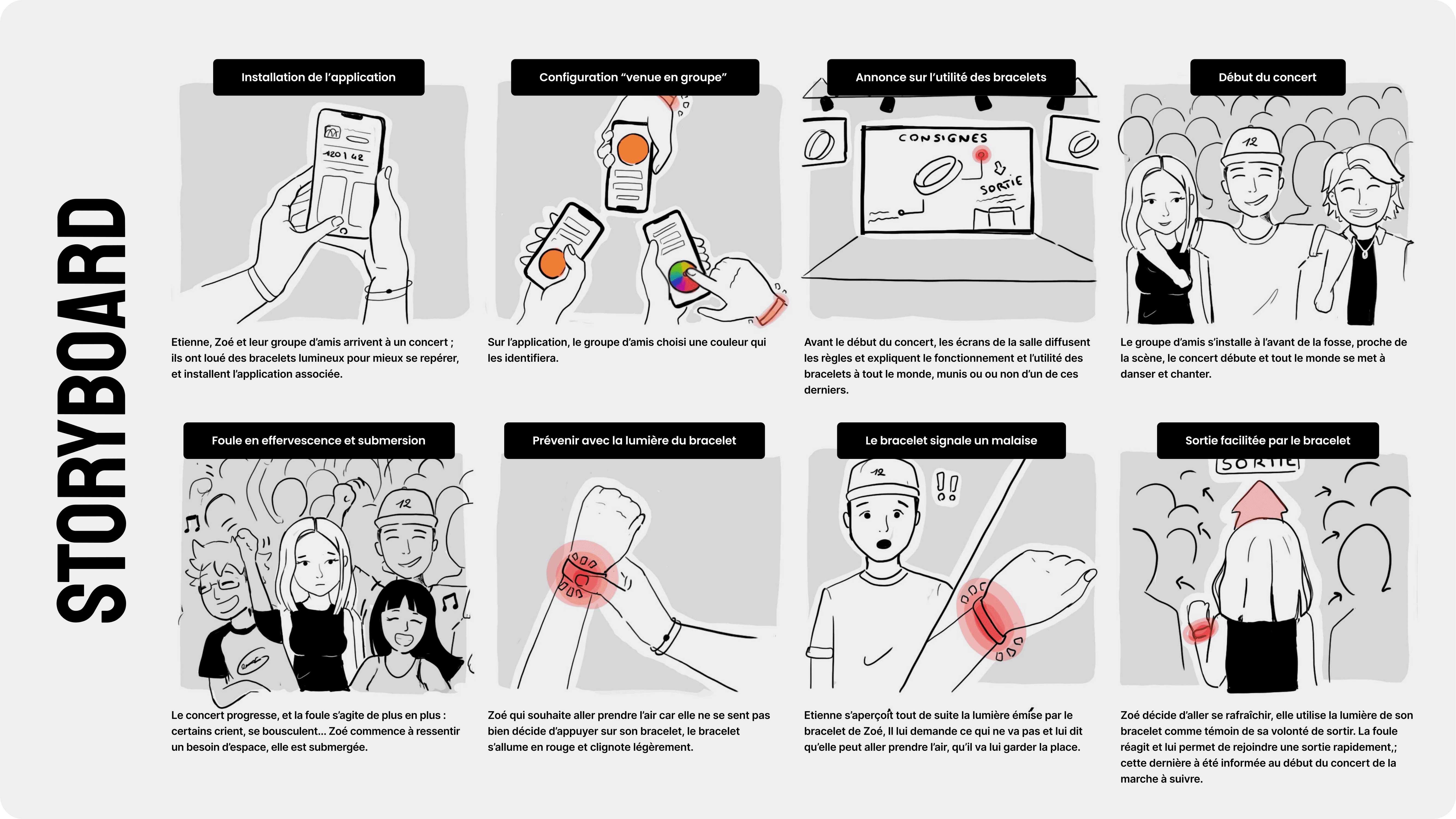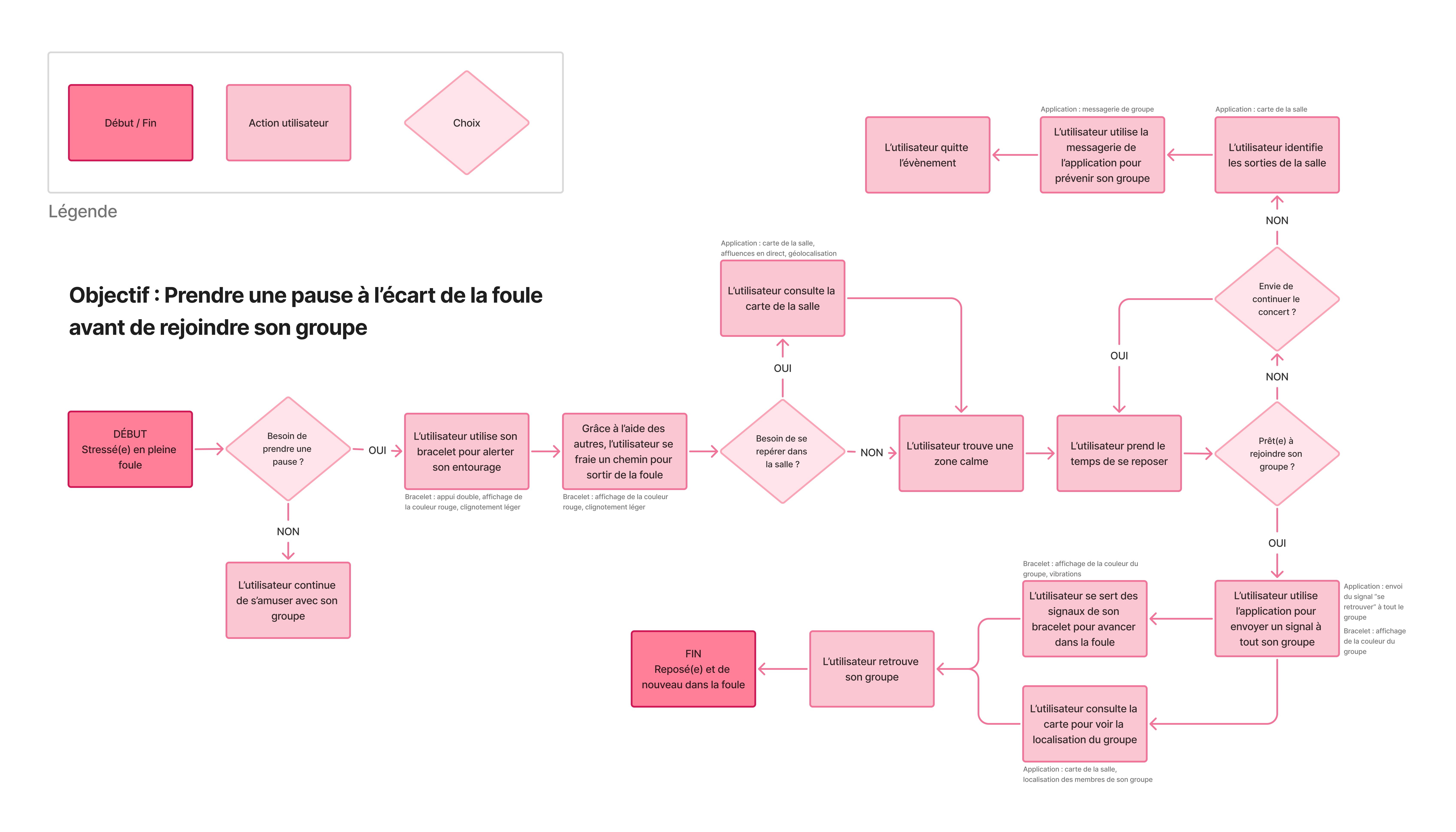 As we converged, it became clear that our solution needed to be both immediate and effortless : something users could activate in the moment, even under stress. That’s why we centred our concept around a connected bracelet, a simple and wearable device always within reach. Two key functions immediately emerged as essential : an alert mode to exit the crowd, and a group mode to reunite with friends. To support these, we mapped out the information architecture and user flow, directly linking bracelet and app interactions. This helped us ensure that both physical and digital components complemented each other seamlessly.