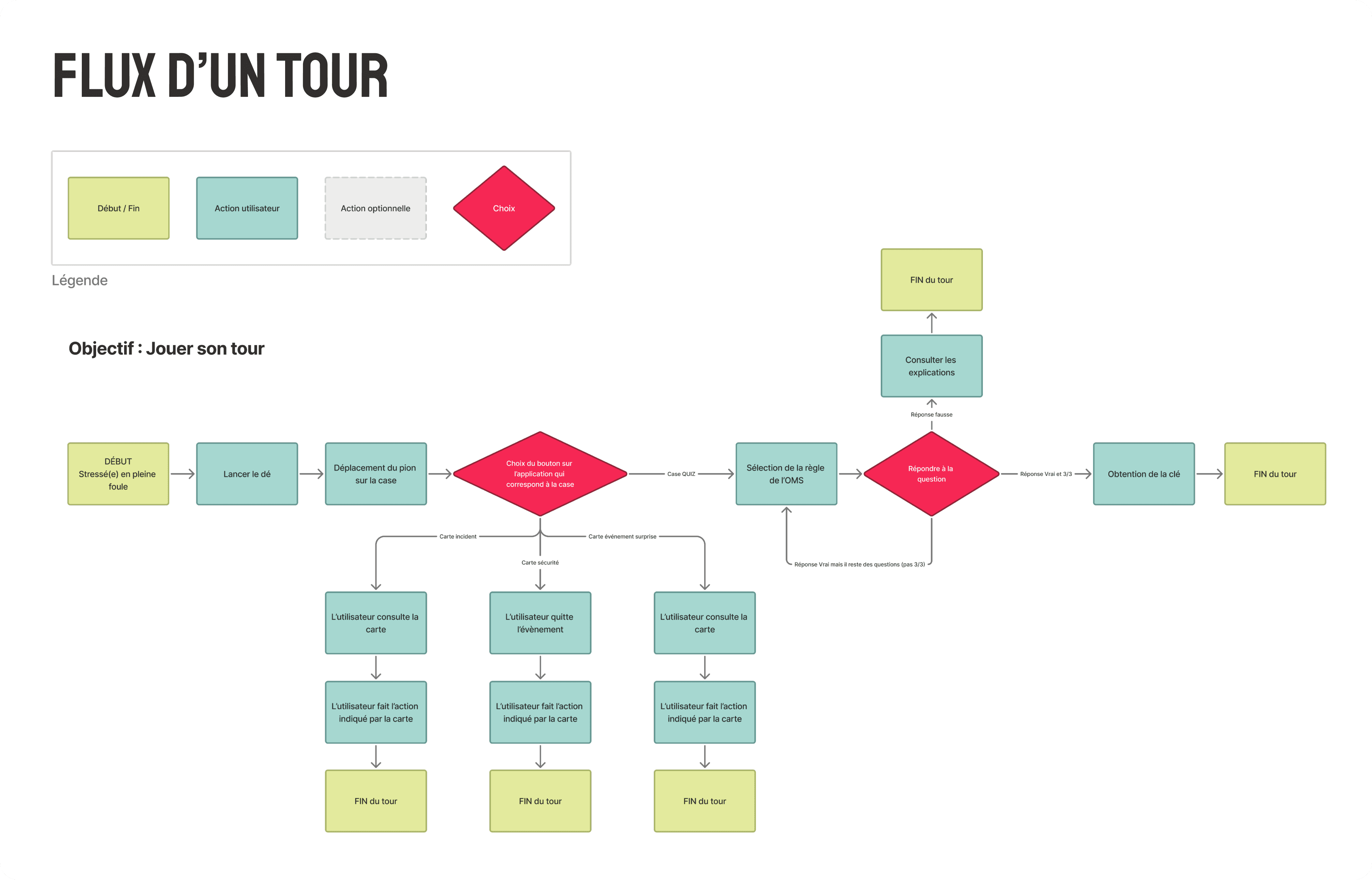 We defined a user flow centered on a complete game turn, allowing us to structure interfaces coherently. In parallel, we developed a clear information architecture to distinguish the roles of each medium. One of our challenges was to ensure the app was not perceived as a mere technological gadget, but as an essential and functional complement to the physical board.