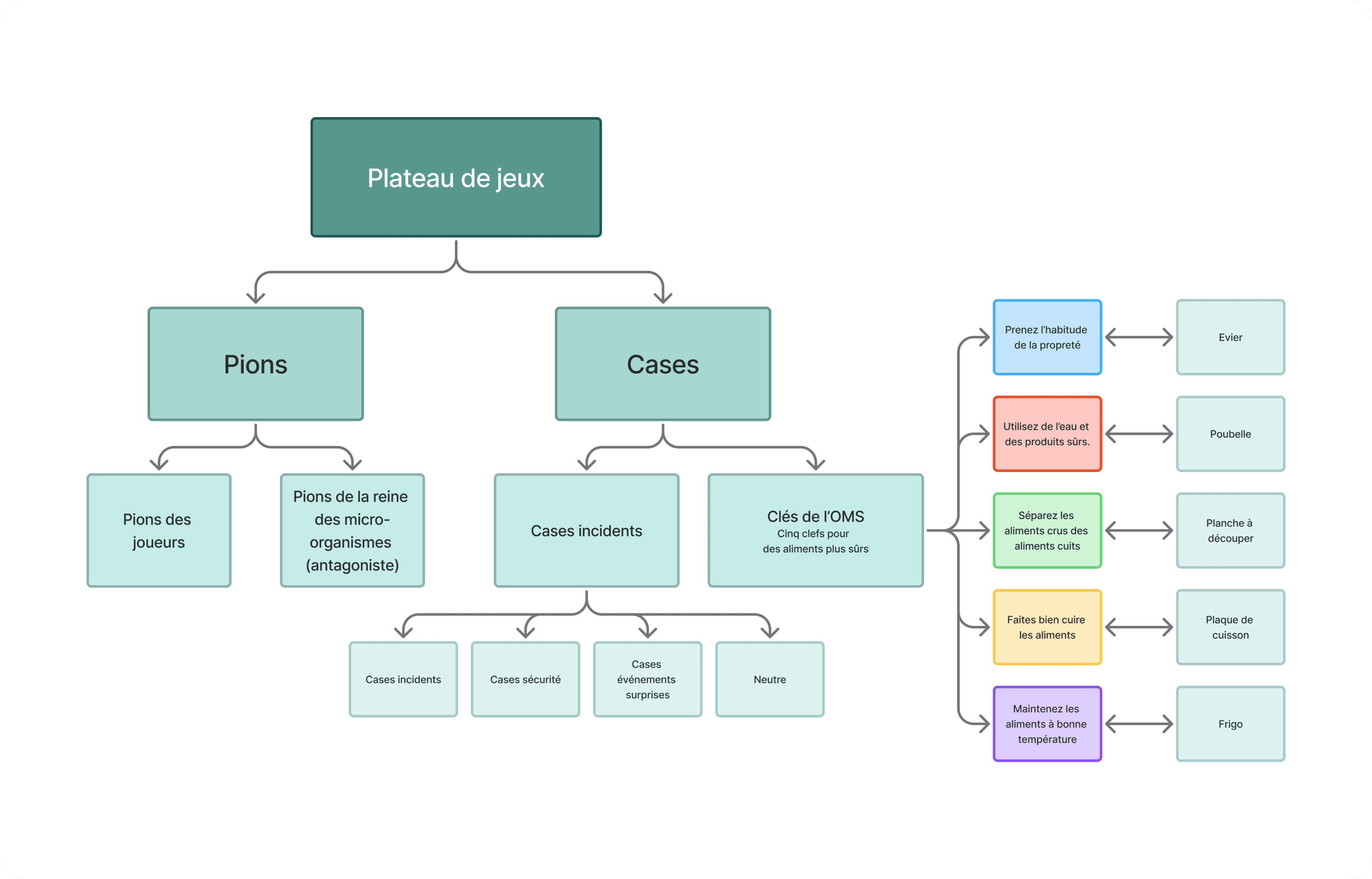 At the core of the game is a circular board representing a stylised kitchen, divided into five strategic zones : the sink (linked to hygiene), the cutting board (cross-contamination), the stove (cooking), the refrigerator (storage), and the trash (product safety). We started by designing the board digitally, then constructed a physical prototype using cardboard, printed paper, and polymer clay. We also created custom game pieces representing food items, alongside physical keys for each WHO category to materialise the player's progress .